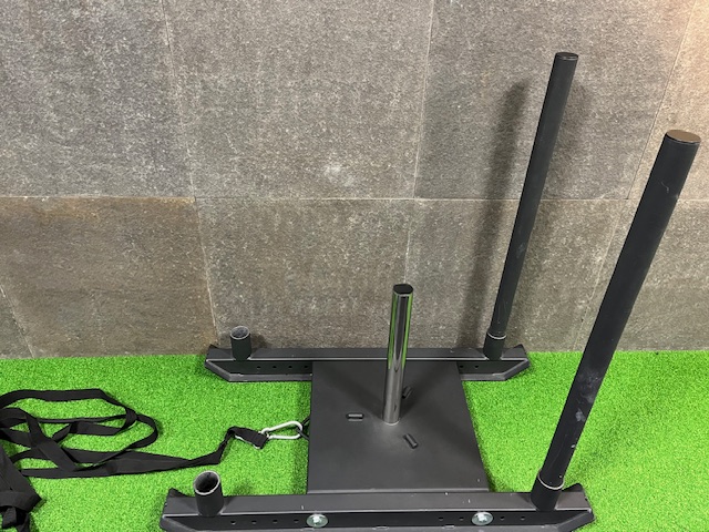 Kelkka Crossfit, Hyrox ja muuhun toiminnalliseen treeniin. Ladataan levypainoilla. Kiinnityspaikka köydelle vetotreeniä varten. Kahvat siirrettävissä molempiin päihin.